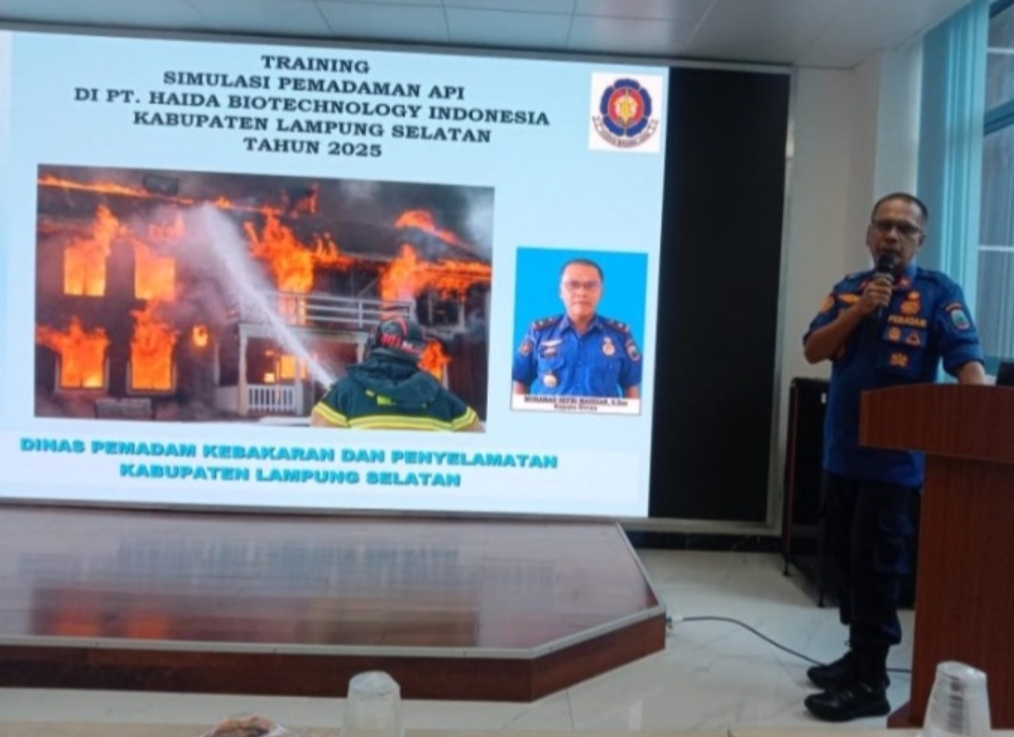 LAMSEL,– Kepala Dinas Pemadam Kebakaran dan Penyelamatan (Damkarmat) Kabupaten Lampung Selatan, Sefri Masdian, memberikan Sosialisasi Pencegahan Kebakaran sekaligus Training Simulasi Pemadaman Api di PT Haida Biotechnology Indonesia, Tanjung Bintang, Lampung Selatan, Selasa (15/4/2025).
