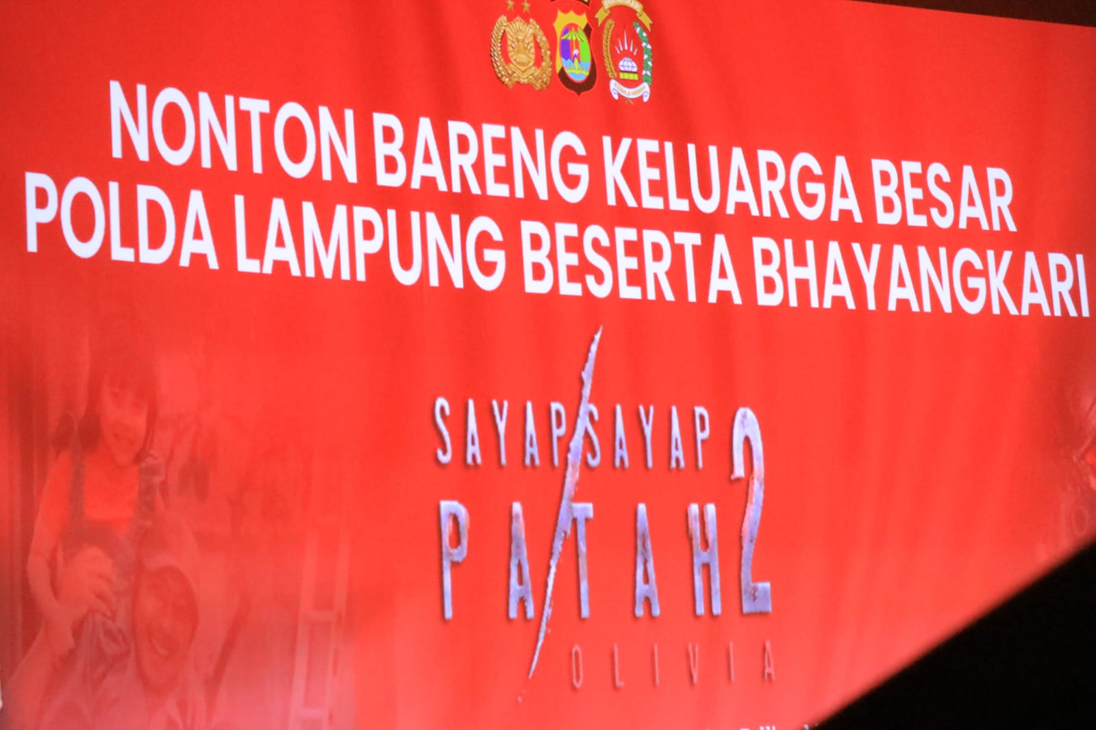 LAMPUNG – Kapolda Lampung Irjen Pol Helmy Santika bersama Wakapolda Brigjen Pol Ahmad Ramadhan dan para Pejabat Utama (PJU) Polda Lampung menghadiri acara nonton bersama film Sayap-Sayap Patah 2: Olivia di Studio XXI MBK Mall, Senin malam (12/5/2025).