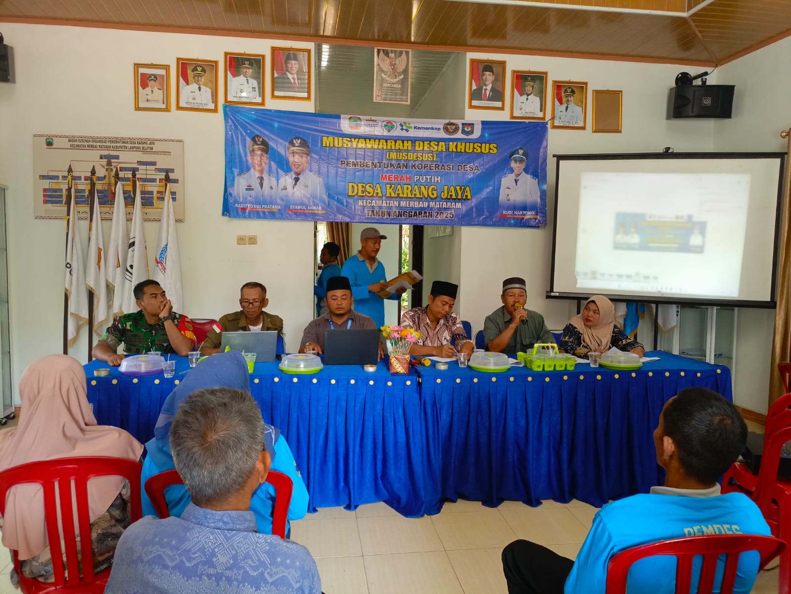 Mudessus pembentukan koperasi desa merah putih Karang Jaya turut dihadiri seluruh kasi, kaur, Kadus dan RT desa Karang Jaya, selain itu hadir Juga Babinsa, Babinkamtibmas, Tokoh agama,Tokoh Pemuda, Tokoh masyarakat pengurus PKK, serta pendamping PKH.