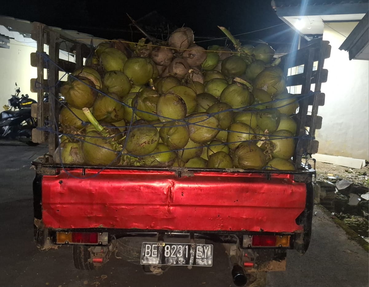 “Barang bukti yang berhasil diamankan dari para pelaku berupa satu unit mobil pick up merk Mitsubishi L300 warna hitam dengan nomor polisi BE 8231 EY atas nama Dewo, sebanyak 500 butir buah kelapa hasil curian, satu bilah golok, serta satu buah senter” pungkas AKP Rudi.