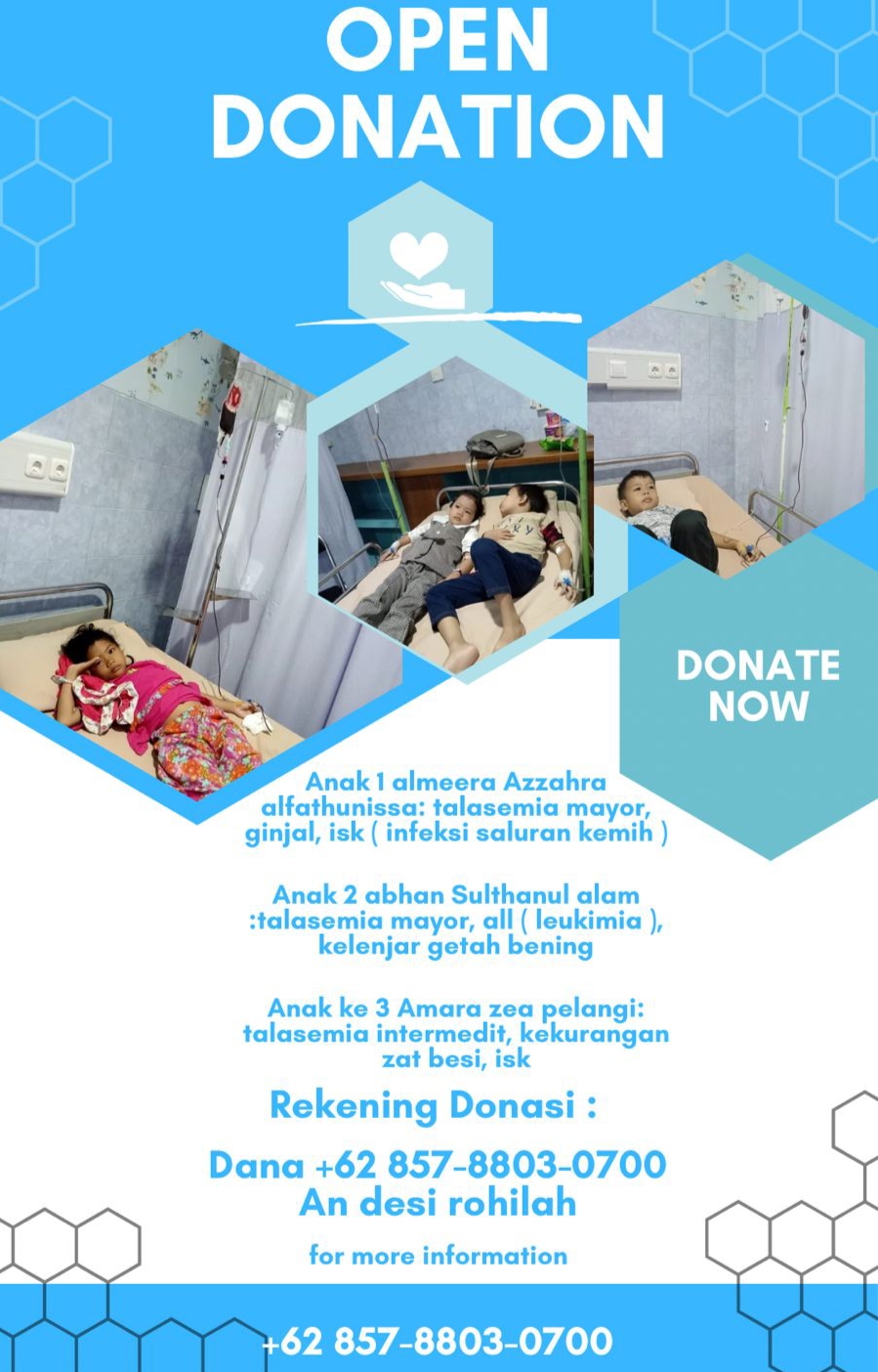 “Setiap bantuan sekecil apa pun, sangat berarti bagi keberlangsungan hidup dan masa depan ketiga anak ini. Mari bersama menjadi bagian dari perjuangan seorang ibu yang luar biasa, demi senyum sehat di wajah anak-anak yang penuh harapan,” tutupnya.