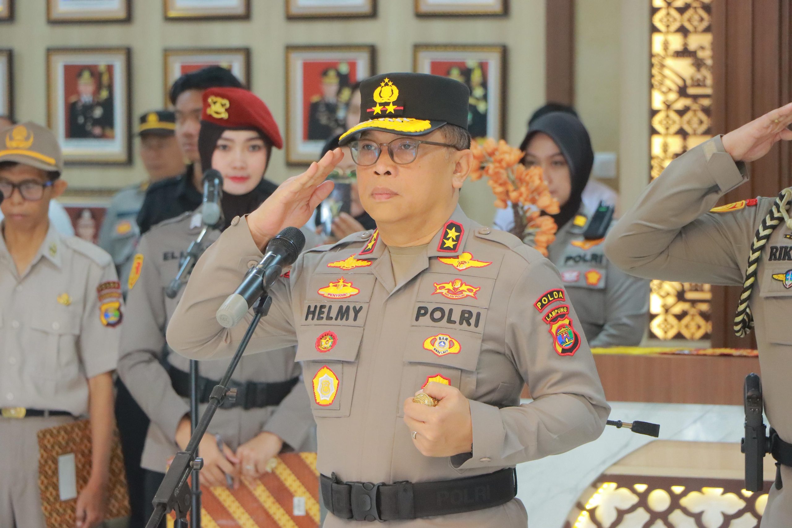 Lampung – Kapoldq Lampung Irjen Pol Helmy Santika, S.H., S.I.K., memimpin Upacara Pemuliaan Nilai-nilai Tribrata. Upacara tersebut merupakan salah satu tradisi dalam rangka memperingati Hari Bhayangkara ke-79 Tahun 2025. Rabu(18/06/2025).