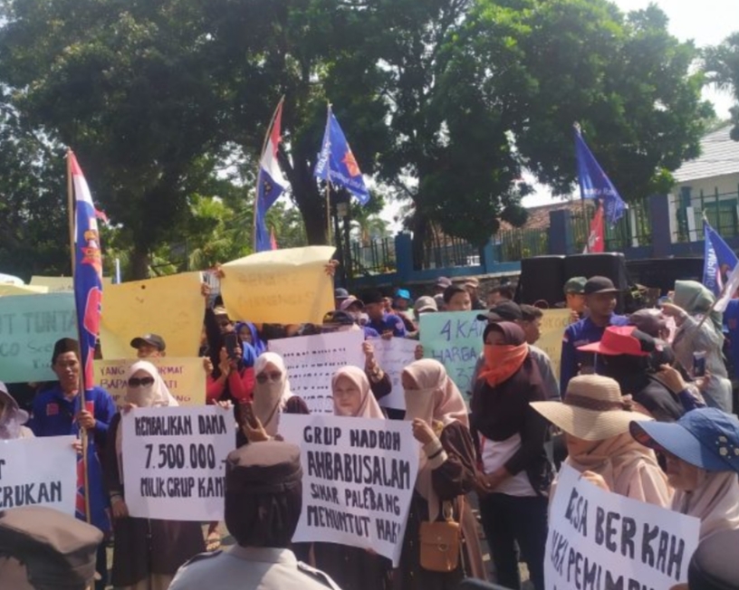 Ratusan warga Desa Sinar Palembang Kecamatan Candipuro Kabupaten Lampung Selatan, menggelar aksi demonstrasi di kantor Dinas Pemberdayaan Masyarakat Desa (DPMD).