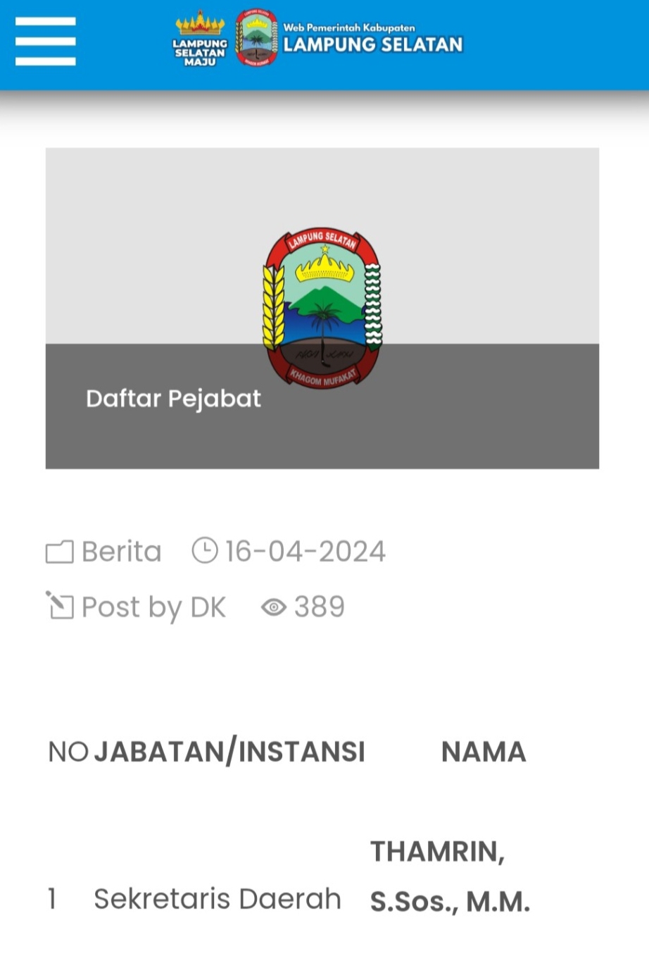 Nampak yang dicantumkan kepala dinas kominfo Lamsel, Anas , di Struktur JABATAN/INSTANSI Nama-nama pejabat kepala daerah, yang lama, kala itu di jabatan Bupati Nanang Ermanto.
