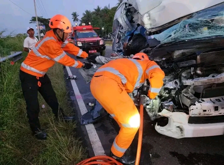 Peristiwa yang melibatkan mobil Toyota Hiace dan truk tronton Hino itu menewaskan dua orang warga Sleman, Yogyakarta.