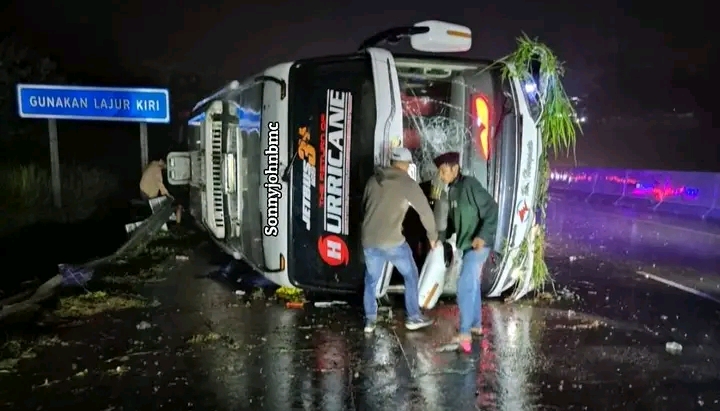 Bus yang berangkat dari Pati menuju Tangerang itu diduga tergelincir saat hujan deras, kemudian terguling, menabrak pembatas jalan, dan terperosok ke parit di luar jalur tol.