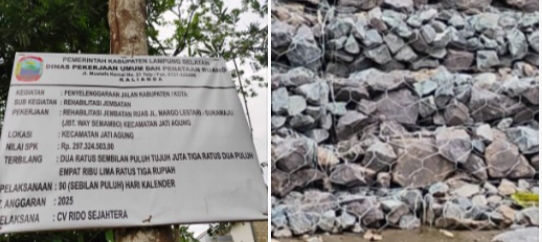 “Iya bg itu pembangunan rehabilitasi jembatan di ruas Jalan Margo Lestari – Sukamaju (Jembatan Way Semambo), Kecamatan Jati Agung, Kabupaten Lampung Selatan, memakai batu yang sangat kecil ” katanya pak Hadi Selaku pengawasan proyek.