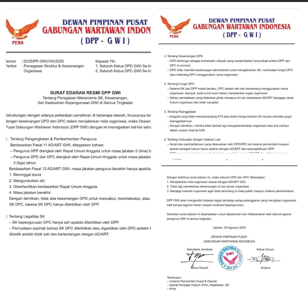 Poto: Surat Edaran Resmi DPP GWI Nomor : 023/DPP-GWI/VIII/2025.