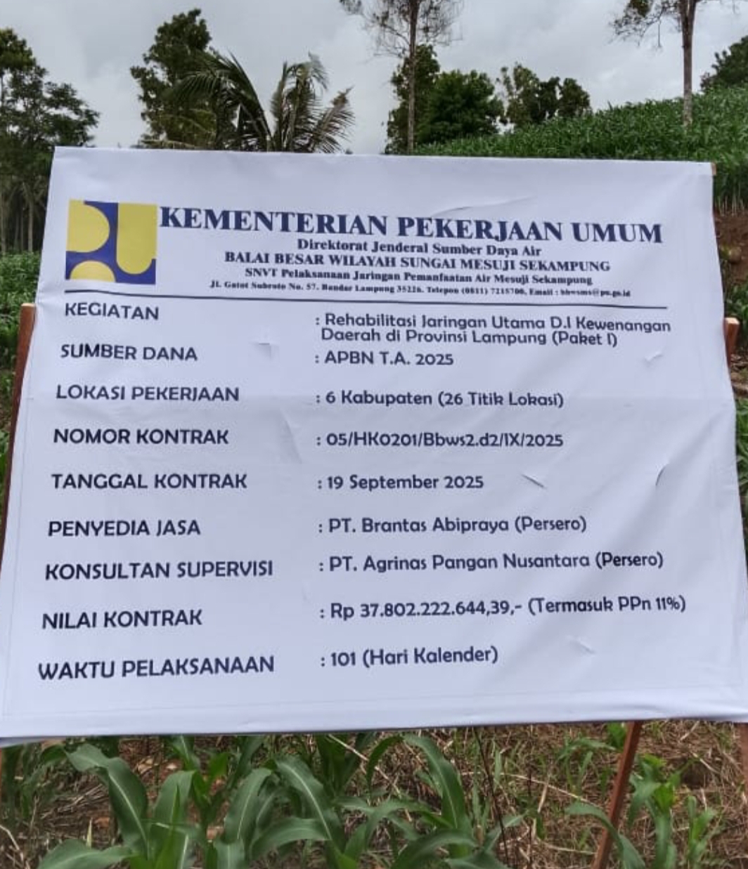 Terpantau’ Proyek bernilai Pantastis miliar ini mencapai Rp37.802.222.644.39. dari APBN Tahun 2025, terbagi di 6 kabupaten di Provinsi Lampung, salah satunya berlokasi di Desa pematang, Kecamatan Kalianda Kabupaten Lampung Selatan. Dikerjakan oleh PT Brantas Abipraya (Persero), dan sebagai konsultan supervisi PT Agrinas Pangan Nusantara (Persero).