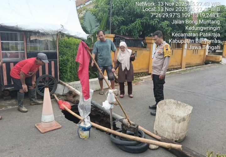 BANYUMAS |Sebuah ruas jalan kabupaten di Desa Kedungwringin, Kecamatan (isi sesuai kecamatan), Kabupaten Banyumas, amblas pada Rabu siang, 13 November 2025. Kejadian ini langsung ditangani cepat oleh Bhabinkamtibmas dan pemerintah desa setempat.