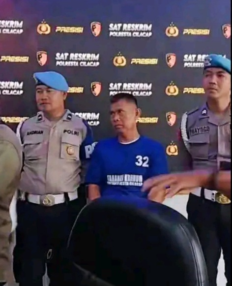 Tersangka diperlihatkan kepada publik dalam konferensi pers di Mapolresta Cilacap, Selasa (2/12/2025). S tampak lemas dan hanya menunduk saat polisi memaparkan kasus tersebut.