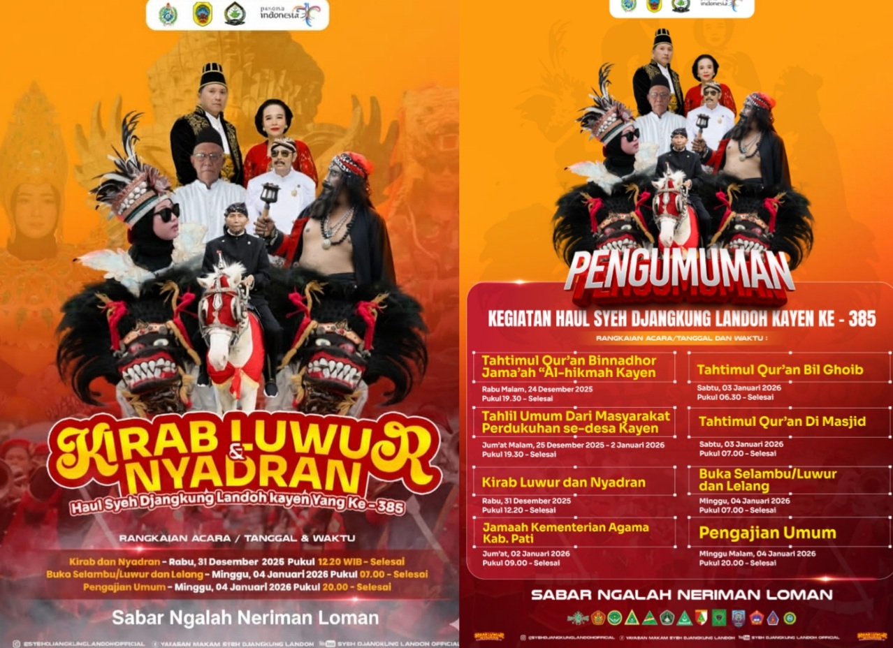 PATI |Rangkaian Kirab Luwur IX dalam peringatan Haul ke-385 Syekh Jangkung atau Mbah Saridin berlangsung meriah di Dukuh Landoh, Desa Kayen, Kabupaten Pati, Jawa Tengah, Rabu (31/12/2025).