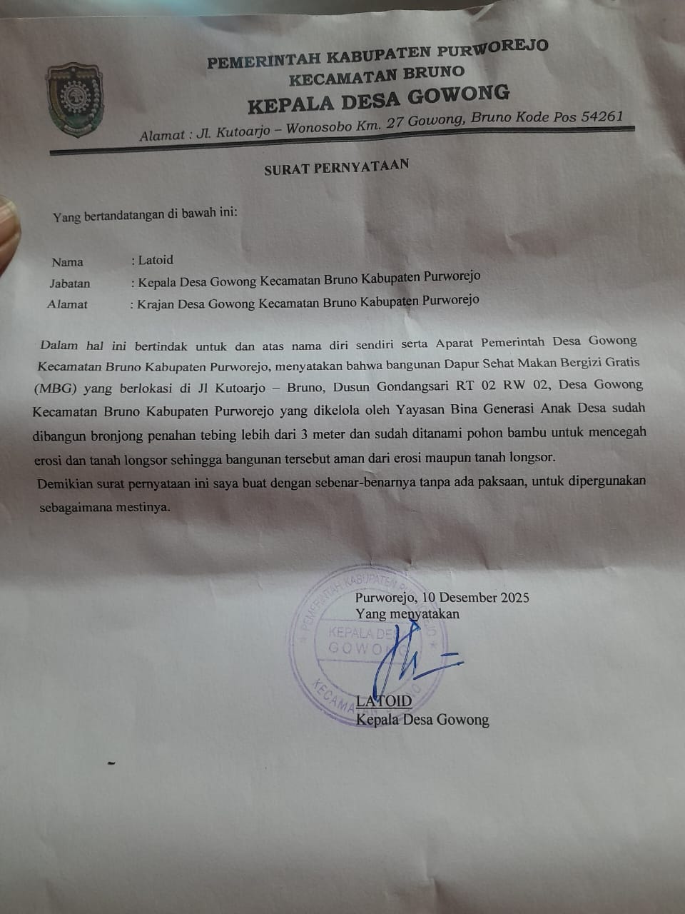 Dalam surat yang ditandatangani langsung oleh Kepala Desa Gowong, lokasi pembangunan SPPG sebelumnya dinyatakan aman dengan alasan telah dipasang bronjong setinggi tiga meter.
