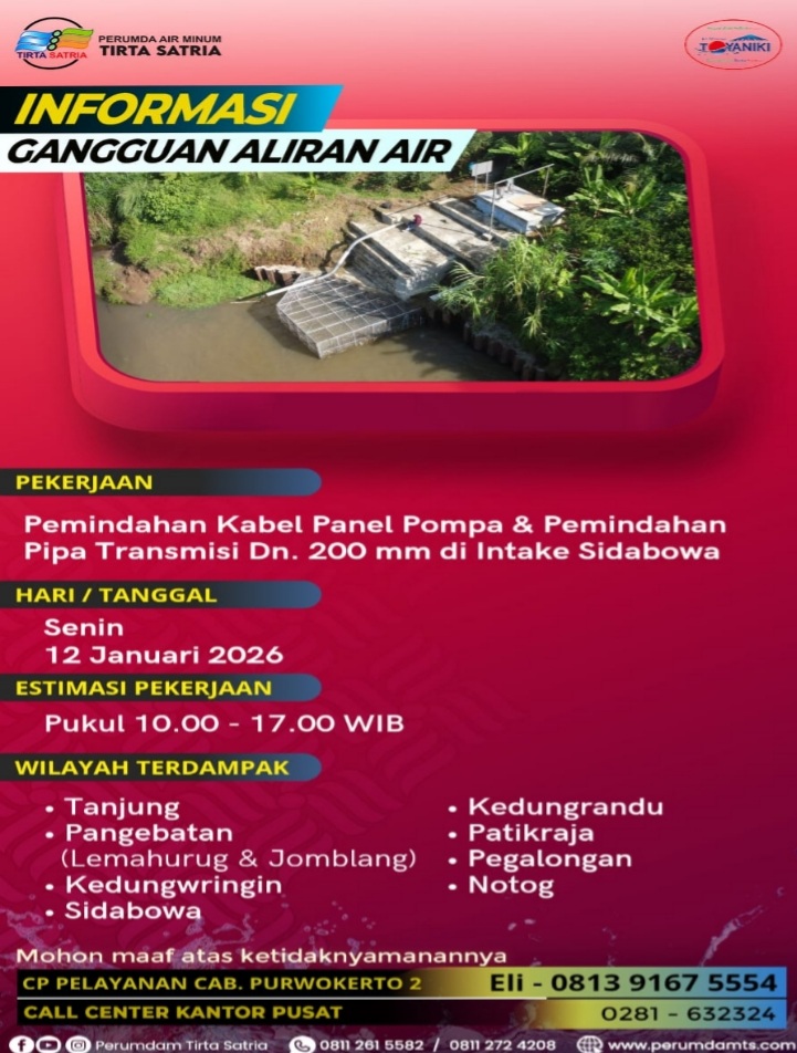 Gangguan aliran air terjadi Senin (12/1/2026) dan melumpuhkan suplai di sejumlah wilayah, mulai Kelurahan Tanjung, Pangebatan, Kedungwringin, Sidabowa, Kedungrandu, Patikraja, Pegalongan, hingga Notog. Ironisnya, pelanggan dibiarkan kelabakan tanpa informasi jelas.