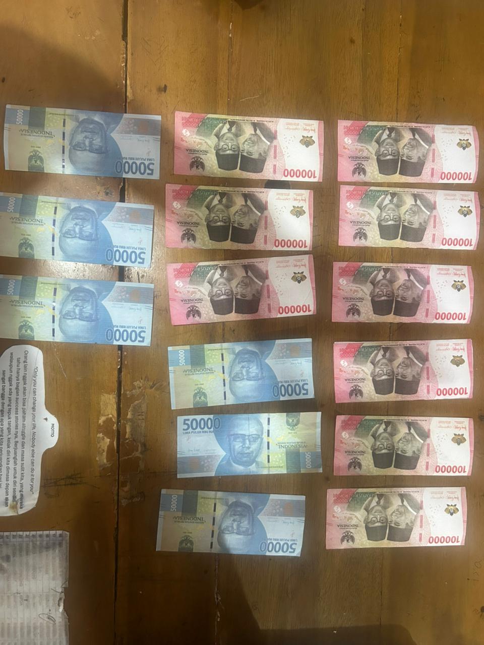 Uang tersebut terdiri dari pecahan Rp 100.000 sebanyak sembilan lembar dan pecahan Rp 50.000 sebanyak enam lembar yang dikemas dalam bentuk paket. Berdasarkan pemeriksaan awal, terduga pelaku mengakui telah beberapa kali menggunakan uang palsu tersebut dalam transaksi.