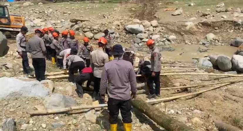 Dalam kegiatan tersebut, personel Brimob bergotong royong mengangkut kayu serta material dasar untuk membangun jembatan darurat. Jembatan ini sangat dibutuhkan masyarakat setempat karena menjadi akses utama penghubung antar desa yang sempat terputus akibat bencana.