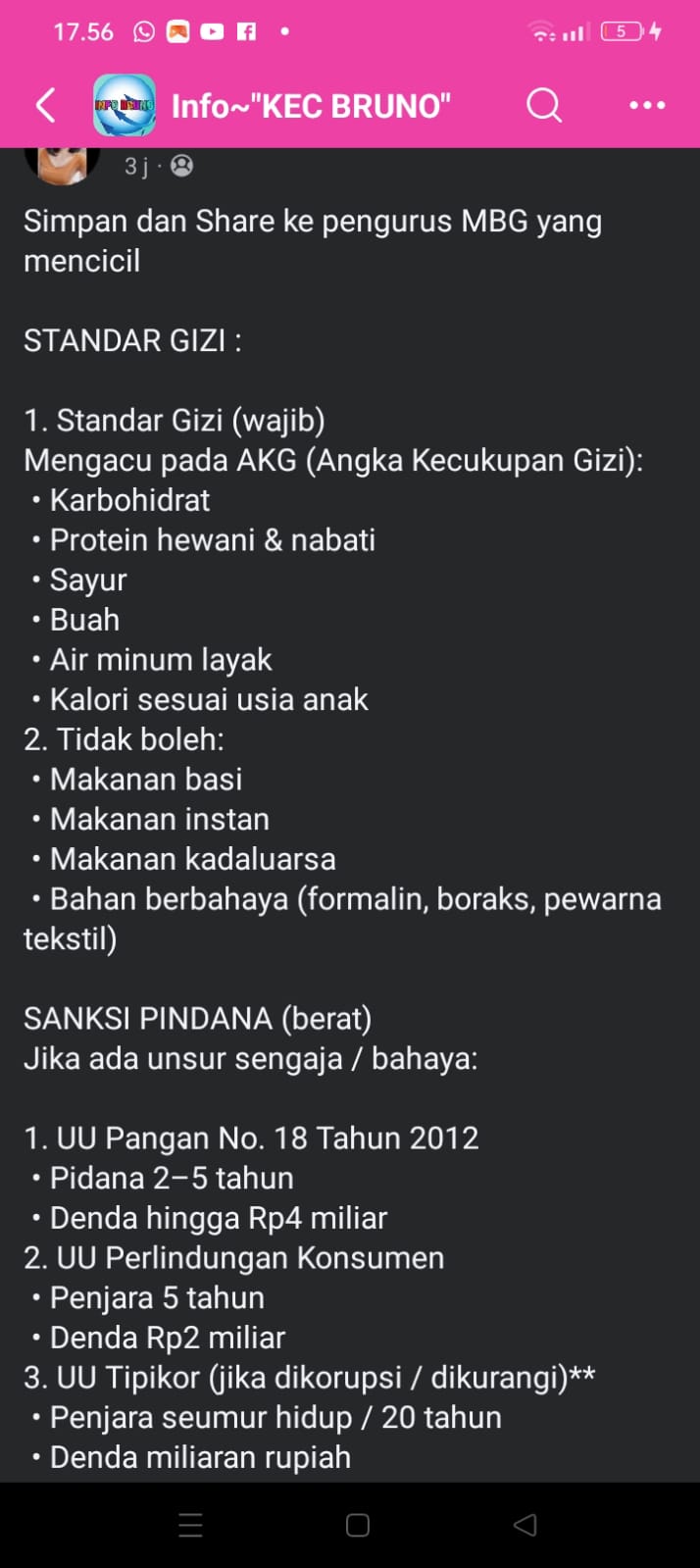 Informasi yang dihimpun menyebutkan, dugaan makanan basi tersebut langsung memicu reaksi keras masyarakat, khususnya para orang tua siswa. Keluhan ramai dibicarakan di media sosial, salah satunya melalui grup Facebook Info-“KEC BRUNO”.