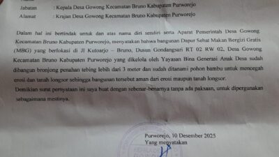 PURWOREJO | Surat keterangan aman pembangunan SPPG yang dikeluarkan Pemerintah Desa Gowong, Kecamatan Bruno,…